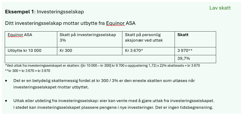 Vi skiller mellom investeringer som du bør håndtere gjennom et investeringsselskap (AS), via personlig aksjesparekonto ASK, eller på vanlig aksje- og fondskonto i ditt eget navn. Innlegget er derfor strukturert med eksempler som gjelder investeringer utenfor fritaksmetoden, og eksempler på investeringer innenfor fritaksmetoden. Aksjer behandles først, deretter renteinstrumenter.